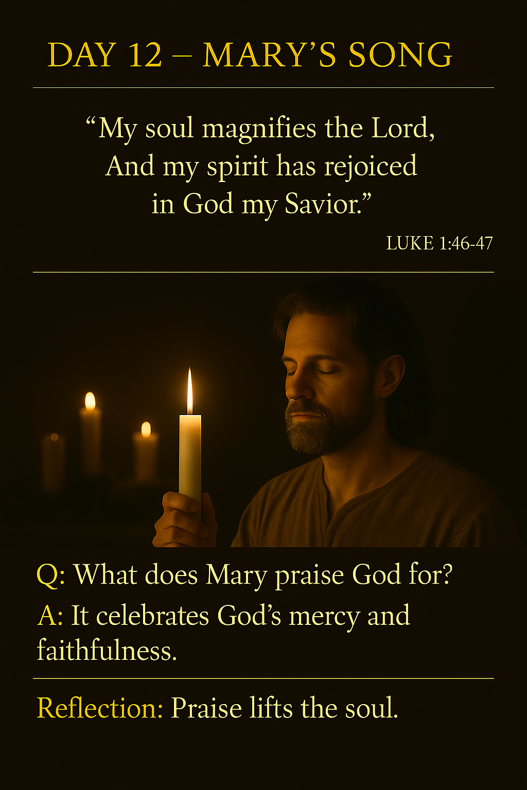 In (Luke 1:46–47), Mary joyfully magnifies the Lord, celebrating God as her Savior and expressing deep gratitude for His mercy and faithfulness toward her.