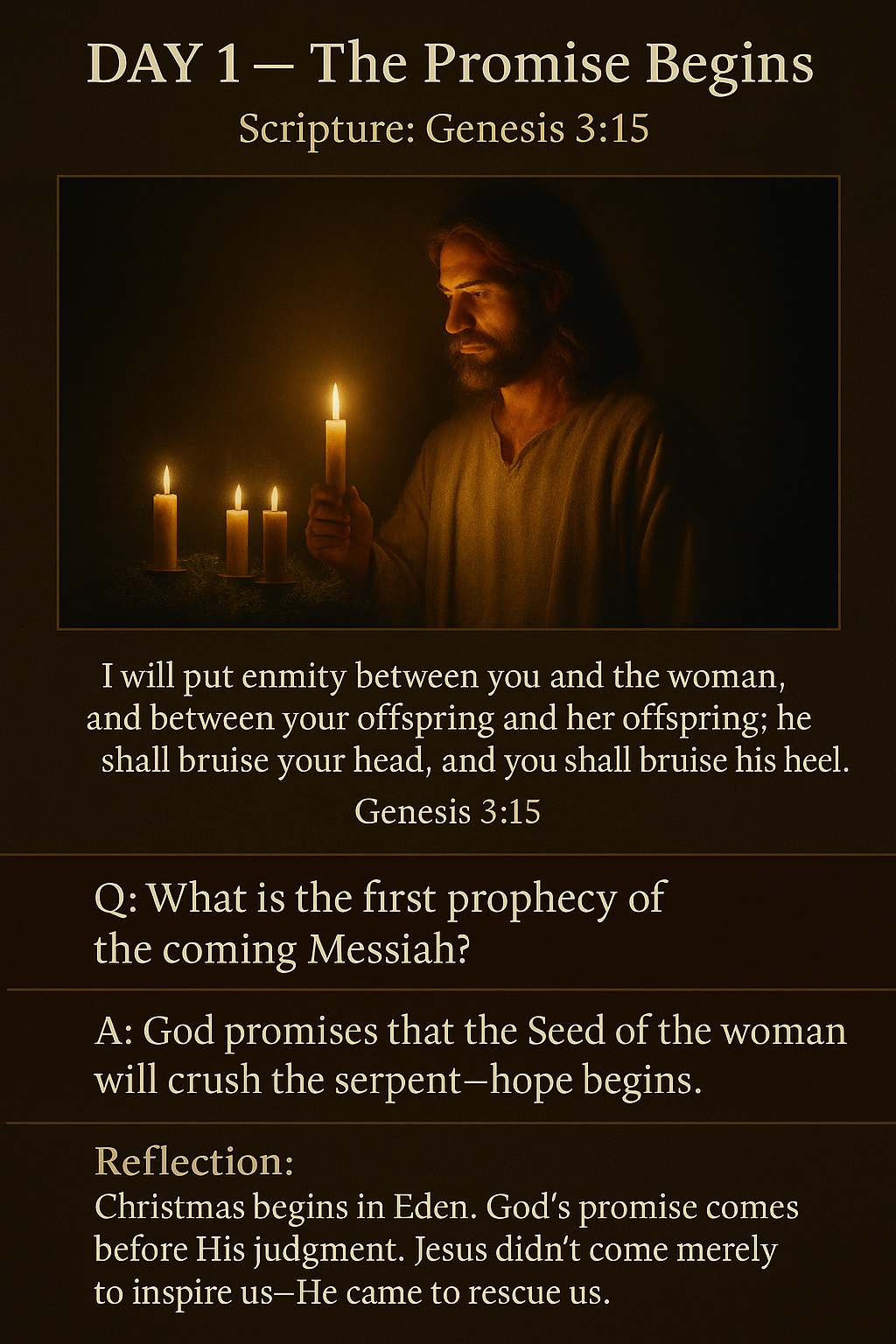 Genesis 3:15 is the first prophecy of the coming Messiah. God declares that a future “Seed” from the woman will crush the serpent’s head, signaling ultimate victory over sin, Satan, and death. It is the very first whisper of Christmas—hope spoken into the darkness of the Fall.
