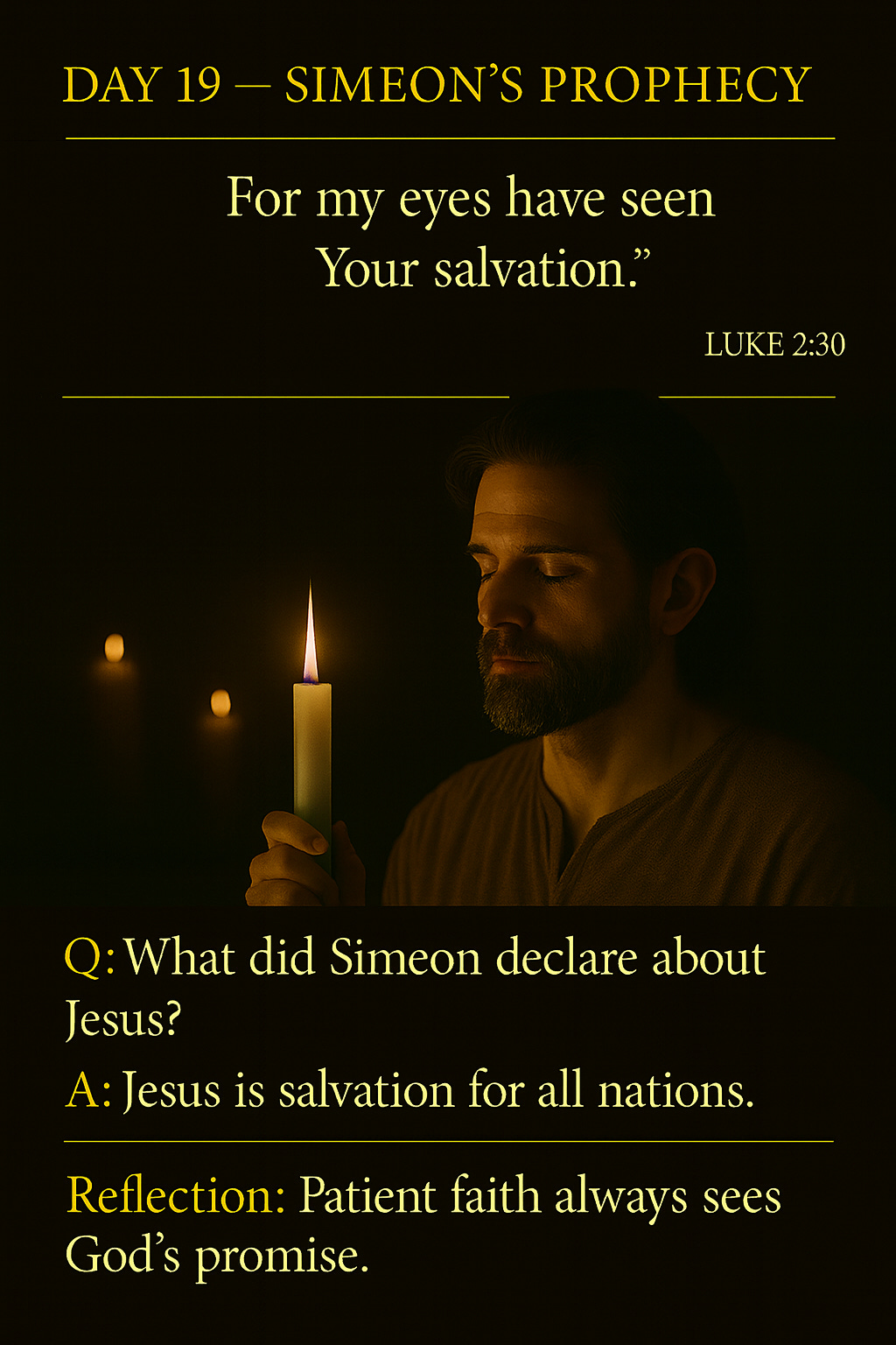 Simeon recognized the infant Jesus as God’s promised salvation, not just for Israel, but for the world. His declaration shows that faithful waiting is rewarded, and that trusting God through delay leads to seeing His promises fulfilled in His perfect time.