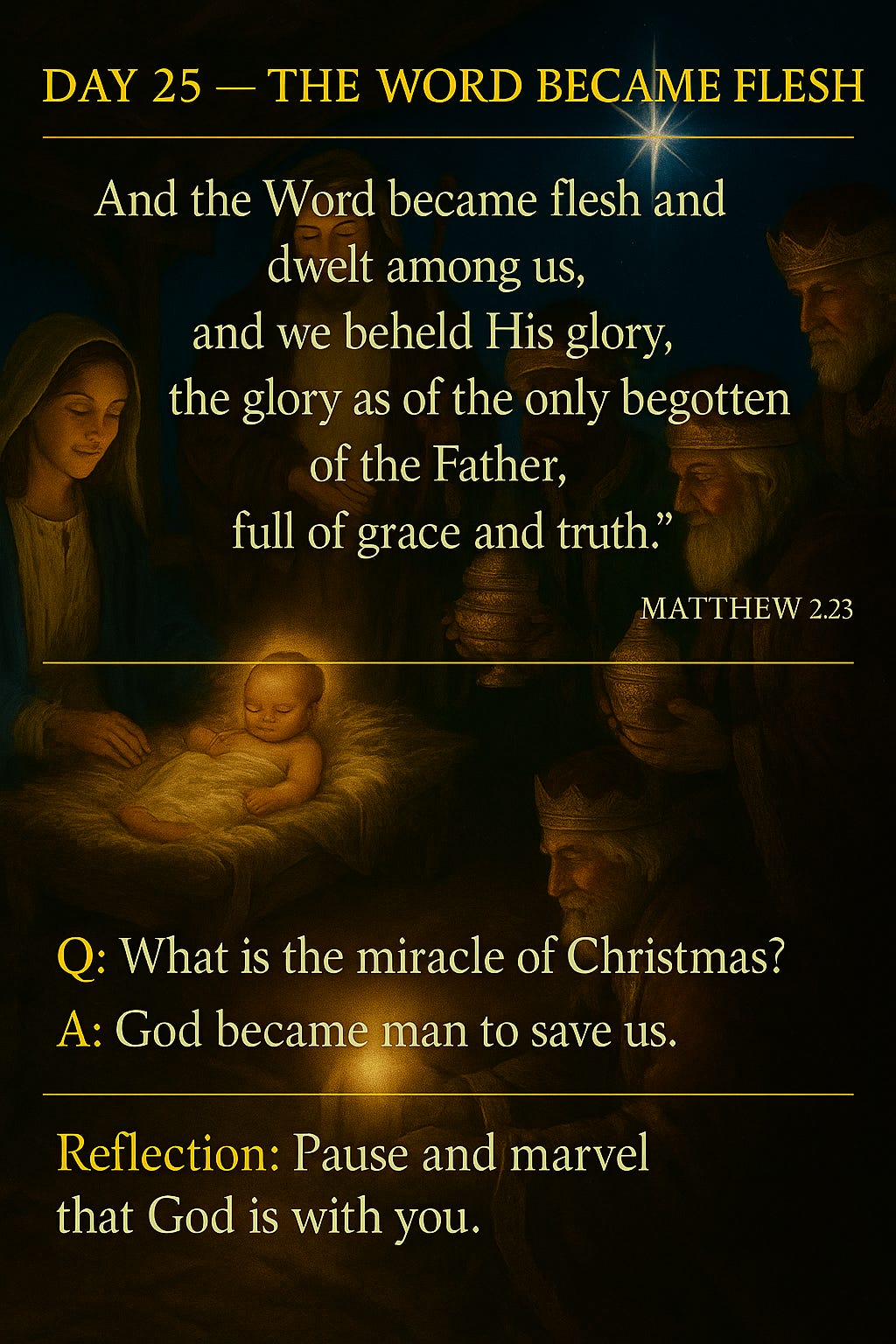 On this day of His birth, heaven touched earth as the eternal Word became human and came to dwell among us (John 1:14). The miracle of Christmas is not simply that a Child was born, but that God Himself stepped into our world—full of grace and truth—to live with us and save us. Today we pause in wonder that the Almighty chose nearness, and we rejoice that God is with us.