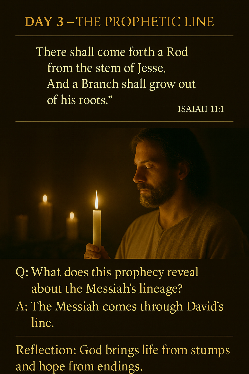 Isaiah 11:1 prophesies that the Messiah would come from the “stem of Jesse,” showing that even when Israel’s royal line seemed cut down, God would bring new life through a promised descendant, Jesus, born from the line of David. This verse reminds us that God restores what appears finished and brings hope from what seems lifeless.